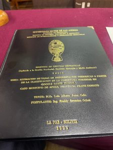 El trabajo fue desarrollado bajo la tutoría del M.Sc. Luis Alberto Poma, y contó con la evaluación del M.Sc. Jary Flores Jemio y del M.Sc. Nelson Huanca Aspi como miembros del tribunal. El acto de defensa fue presidida por el Ph.D. Huber Augusto Mamani Gutierrez – Director de Carrera